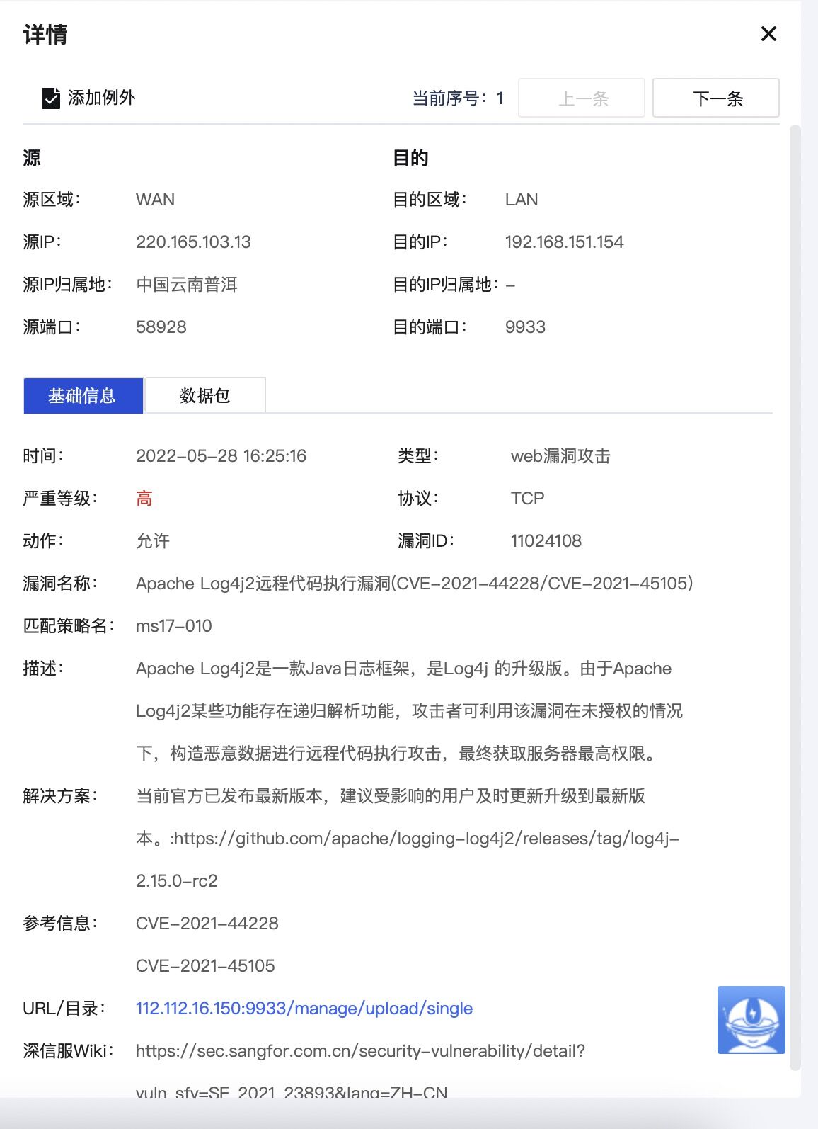 2022-5-30周一,早上上班既有项目部陆续报无法访问VPN ,截止11点有三个项目部:[经排查交投防火墙,发现拦截记录,根据日志分析,影像系统的运行环境存在可能的漏洞: apache-Log4j2远程代码执行漏洞。分析得出,项目部的扫描员在进行影像上传的过程中,可能因为本地电脑存在病毒通过此漏洞对服务器发起了攻击,遂被防火墙拦截。]