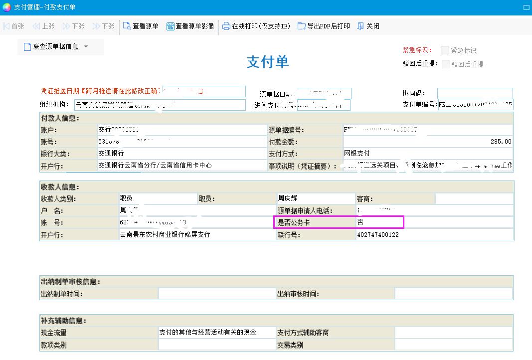 支付单上增加了职员的银行卡类型的显示: 是否为公务卡。
