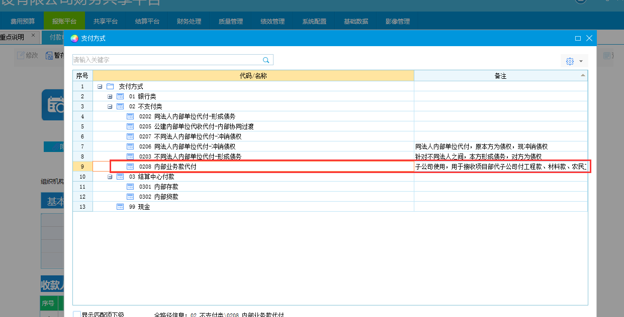 系统新增支付方式0208(不支付类),一般为子公司使用,运用于接收项目部代子公司支付给外部单位的工程款、材料款、农民工工资等。此支付方式带出来的科目为贷方的应收账款-应收内部单位款,子公司使用时候挂的是项目部的客商,这样可以一起减少应收款。