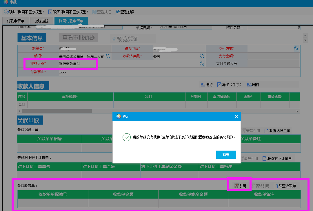 [NEW]协同付款单引用收款单和协同收款单 发布于 2020-10-15 267 次阅读 因项目部现在之后农民工工资需要银行支付需要大量的个人银行卡, 时常发生农民工账号账户错误被也会有退款的情况, 故此需要在协同付款单的 退款重付业务上可以引用到收款单和协同收款单。 10-15 ok