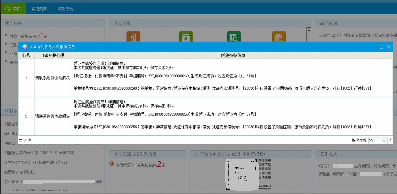 因协同上线后,为实现一对协同单据同时推送凭证, 收付协同的单据是通过系统后台的计划任务定期自动进行推送的,导致了报错信息无法再前台提示, 需要业务人员人为主动联系管理员去查询系统的日志。