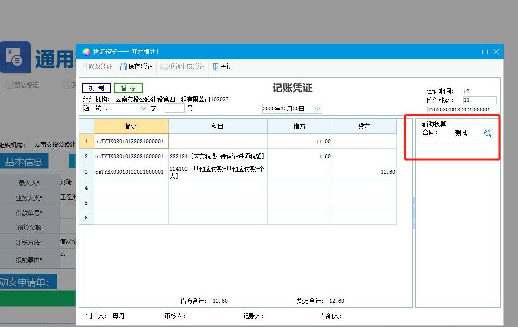 1-12 :对新增科目和新增辅助进行检查和单据填写规则测试【操作: 测试系统 103038】。