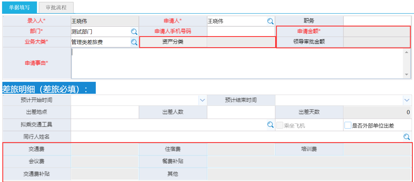 - A001001, A001002, A001003, A001004, A001005差旅费的业务大类,不再填写金额,也不再控制预算,只填报事项:需要隐藏金额相关的字段,不填也不显示。